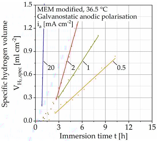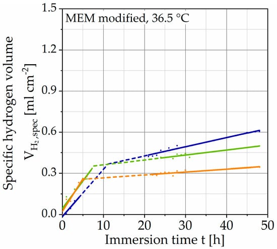 Figure 4 shows the results of immersion tests without polarization plotted with the specific hydrogen volume over the immersion time t. It shows the individual data points, as well as two regression lines for each test. Since the data are measured manually, there are gaps in the data shown by dotted lines. The curves exhibit an almost linear behavior at the beginning of the immersion, after 5–11 h, it turns into another linear region of the lower slope.