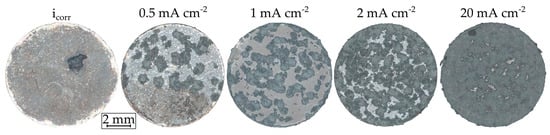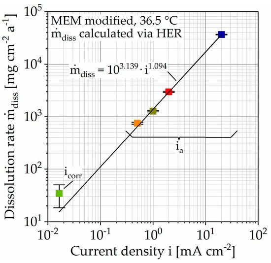 It should be noted that Equation (2) assumes constant unaccelerated corrosion rate corr and accelerated dissolution rates diss. For the immersion tests without polarization, this is assumed in good approximation (see Figure 4). Since the tests with polarization (see Figure 5) did not show any time-dependent hydrogen evolution rate (HER), this assumption is also correct. For long-term immersion tests (of several weeks) with time-dependent corrosion behavior, the variation of the current density is also conceivable. Calculation of the current density via a weighted mean corrosion rate is as well possible.