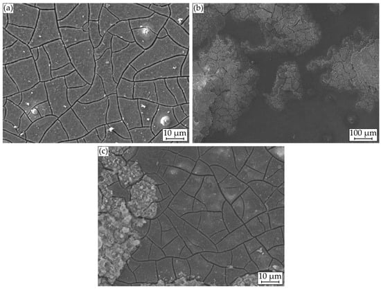 Exemplary for the unaccelerated tests, Figure 7a shows a SEM image of the corrosion layer, exhibiting a uniform, cracked corrosion morphology typical for magnesium. Brighter circular and stick-like inclusions can be seen in the layer, indicating enrichments by the alloying elements. Circular and spherical formations are also deposited on the layer, arranging themselves in circles of different diameters around the sphere.