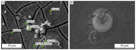 Microstructural investigations on Mg WE43 after immersion in a modified minimum essential medium at 36.5 °C: (a) SEM image for EDS point analysis after 48 h at icorr; (b) with galvanostatic polarization at ia = 0.5 mA cm−2.