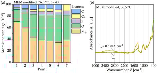 Composition of the corrosion layer of Mg WE43 after immersion in a modified minimum essential medium at 36.5 °C: (a) Results of EDS point analysis after 48 h at icorr; (b) FTIR traces after 48 hours’ immersion at icorr and with galvanostatic polarization at ia = 0.5 mA cm−2.