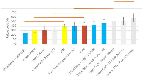 Failure load of bilayered veneer zirconia after 24 h in water. All groups under the same horizontal line are not significantly different to each other (p < 0.05).