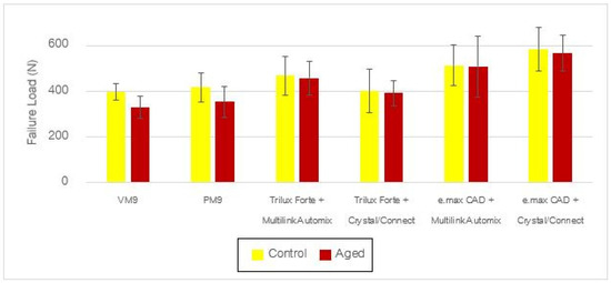 Regarding modes of failure of specimens. Hand-layered and press-on ceramics failed predominantly catastrophically except IPS e.max ZirPress. For CAD-/CAM-milled veneer, fused e.max CAD failed exclusively catastrophically while cemented e.max CAD with Panavia 21 failed mostly with porcelain chipping/delamination. The rest of CAD-/CAM-milled veneer failed relatively equal between catastrophic failure and porcelain chipping/delamination. The mean failure load ± standard deviation values for each group after simulated aging was shown in Figure 3. The specimens veneered with hand-layered and pressed veneer had significant lower failure load after the accelerated aging process (p < 0.05), while the failure load of all the specimens veneered with CAD-/CAM-milled veneer remain no different after aging (p > 0.05).