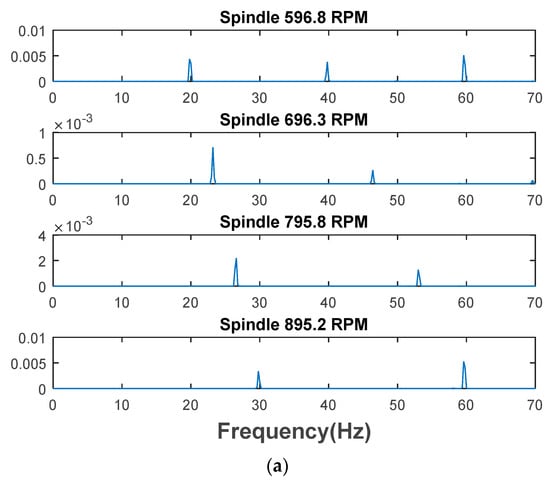 On the other hand, the frequencies at which the signal energy is concentrated vary along with the spindle rotating speed, as shown in Figure 4a that illustrates the spectrum of a vibration signal set under different spindle rotating speed. The frequencies were then normalized by the spindle rotating frequency to obtain the order spectra as shown in Figure 4b. It is apparently observed that the spectral peak can be found at order-2 since there are two blades in one cutter, and thus the vibration energy concentration is noted at the frequency of two times the spindle rotating frequency, which is the tool passing frequency. Therefore, the vibration amplitude levels at the indicated orders represent the spindle rotating speed-related features in frequency-domain.