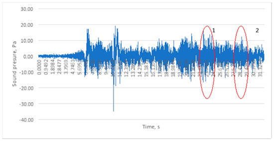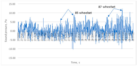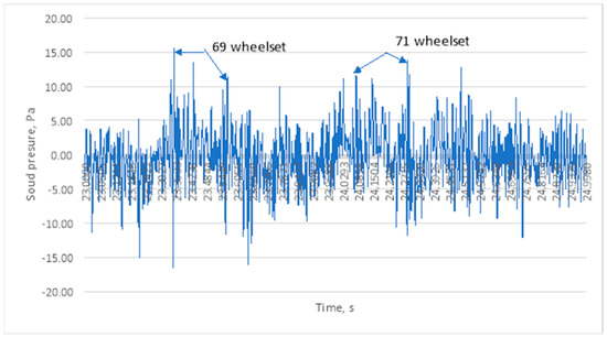 From the diagrams given in Figure 7 and Figure 8, we can see that for each defect only two sound pressure change peaks were registered. This is related to the distance of the device to the point of contact of the wheel defect. The rolling stock is moving, but the place of measurement is fixed. Each defect is repeated only around every 3 m, so in case it is desired to detect two sound pressure change peaks, the rolling stock must travel 6 m, and for three peaks it must travel 9 m. As we can see in Equation (6), the sound pressure depends significantly on the distance. Thus, in order to register more peaks, more microphones would be needed.