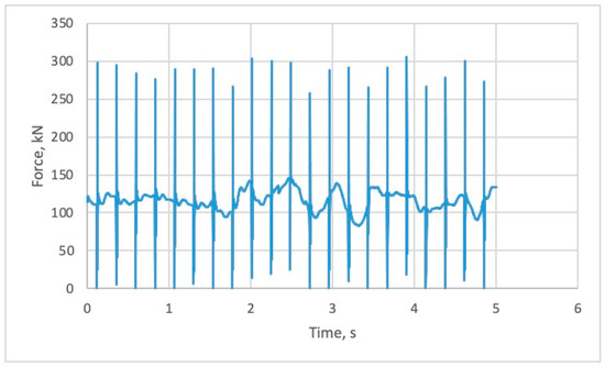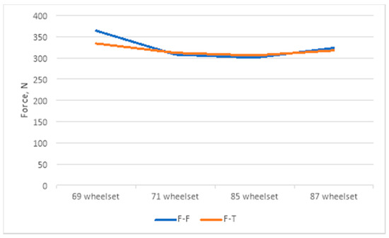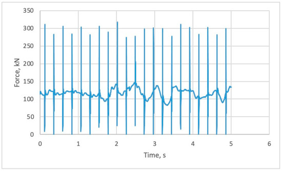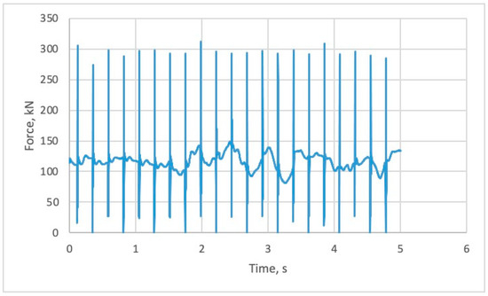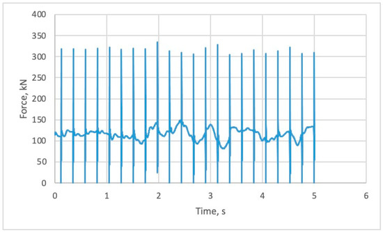Calculations were made taking into account the physical experiment data of the track condition, wheelset load and speed. Maximum and reference forces were obtained. The results are presented in the Table 9 and in Figure 9, Figure 10, Figure 11 and Figure 12.