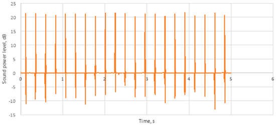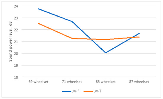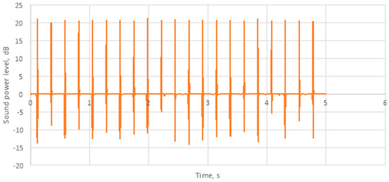This is most probably related to the selected methodology of the physical experiment, i.e., with the distance of the microphone from the spot where the wheel defect contacts the rail. During the physical experiment, there was virtually one fixed microphone, and the rolling stock was moving. As we can see from the Equation (7), the sound pressure depends significantly on the distance between the measuring device and the measured object (source of the sound pressure impact force caused by the wheel defect). Each impact force caused by the wheel defect repeats at a specific period according to Equation (1); however, in practice, this happens after traveling some distance, i.e., every 3 m. So in case it is desired to detect three sound pressure change peaks, the rolling stock must travel 6 m, and for four peaks it must travel 9 m. Due to the changes of the sound pressure peaks, two peaks were registered during the physical experiment, and the theoretical sound power changes were different from the ones registered during the physical experiment.