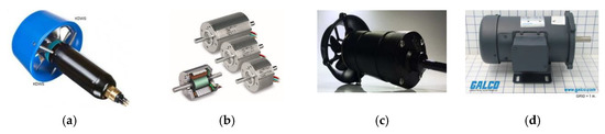 Representative Direct Current (DC) motors used as actuators for unmanned underwater vehicles (modeled in Equations (1) and (2) as described in [8]). (a) Marine Propeller DC motor [32]. (b) Unmanned Systems Technology DC motor [33]. (c) Maxon EC-i 40 DC motor [34]. (d) Galco Industries DC Motor [35].