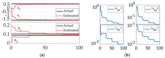 Figure 5a reveals nominal performance following the square wave, and the performance included the ubiquitous overshoot and settling behavior at each switch of the square wave. The (not depicted) discrete control signal produced “ringing” in the control with a period of two sampling periods, while the continuous version zeros (as derived in Section 3.4 of [8]) displayed in Figure 5a eliminated ringing but retained the characteristic overshoot and settling behavior at each switch of the square wave. Relative to the earlier presented instance of no zero cancellation, Figure 5b reveals essentially no oscillation amidst convergence towards steady-state gain. Figure 6a displays estimation by least squares, while Figure 6b displays extended least squares’ attempts to estimate the residuals.