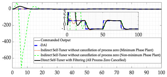 Implementing the procedure in Section 2.3 of this manuscript using the sinusoidal trajectory of Section 2.2 to mimic the steps in the square wave, Figure 8a displays an initial overshoot twice as large as in the case of the indirect self-tuner without process zero cancellation (minimum phase plant), but much less than the other cases investigated. More significantly, it appears to have eliminated the repeated overshoots and settling at each switch of the square wave.