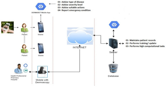 Figure 3 depicts the application-level design. Two separate mobile applications are shown. They represent the two kinds of edges, one for the community (this module is not covered in this study) and the other for health practitioners (dermatologists). The community module aims to support patients in getting fundamental knowledge regarding skin diseases, as well as to motivate and assist users in visiting relevant health practitioners (nearest available dermatologists). In comparison, the health practitioner module is equipped with a dermoscopy device, which performs more detailed analysis of the captured dermoscopy images until diagnosis. This module also continuously transfers the updated weights of new samples (after each classification) to its cloud counterpart. Fundamentally, the health practitioner module can work together with the dermoscopy device by providing predictions (to health practitioners) regarding the skin disease type. Figure 4 represents the module and detailed architecture of the proposed model. This prototype was initially developed for the four most common skin diseases (mentioned in the International Skin Imaging Collaboration (ISIC) 2019 dataset). Later, it can incorporate new skin diseases through its adaptability feature. In future work, the provided model will be tuned with a multimodal solution (taking into account the input skin disease image and the patient’s medical history) to detect and monitor the patient’s progress, as depicted in Figure 5.