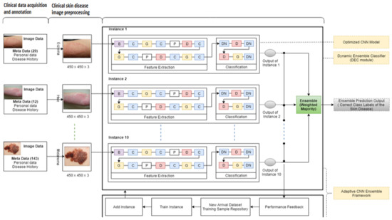 In contrast, some other studies worked on optimized feature extraction processes and determined that the spread of chronic skin diseases in different regions may lead to severe consequences. For example, [28] proposed a support vector machine-based model that automatically detects eczema and determines its severity on the basis of three different stages, i.e., effective segmentation, extraction of optimized features (color, texture, and borders), and severity of the disease itself. Another impressive attempt was made by [29] to extract more appropriate features. This study used the joint power of computer vision and machine learning to detect six types of skin disease. However, these studies were not adequate when addressing similar features across multiple diseases (e.g., some types of eczema show similar features to cancer); as such, wrong classifications may be obtained. The feature similarity issue can be overcome using low-level feature extraction techniques. For that reason, deep learning approaches (such as the convolutional neural network) are more desirable due to their pixel-level feature extraction process. Recently, several studies used deep learning-based techniques to classify similar features more accurately. In [30], a hybrid approach was designed by using a combination of shallow learning- and deep learning-based pretrained models, such as AlexNet and support vector machine. A recent study [31] highlighted the enormous potential of deep understanding to detect skin diseases with human-like diagnosis accuracy or better. Furthermore, this study urged the utilization of deep learning-based real-time intelligent healthcare systems for clinical utilization. The current approaches are only based on the batch learning approach and are static; thus, they do not welcome any future change (i.e., the model would need to be retrained if any changes are required). However, clinical procedures require a continuous upgradation to increase their accuracy and add new kinds of skin disease, rendering the current static deep learning approaches inapplicable. Accordingly, new adaptive mechanisms are required to ensure adaptability with high classification accuracy.