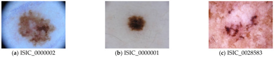 - Codella, N.; Rotemberg, V.; Tschandl, P.; Celebi, M.E.; Dusza, S.; Gutman, D.; Helba, B.; Kalloo, A.; Liopyris, K.; Marchetti, M.; et al. Skin lesion analysis toward melanoma detection 2018: A challenge hosted by the international skin imaging collaboration (ISIC). arXiv Prepr. 2019; arXiv:1902.03368. [Google Scholar]
