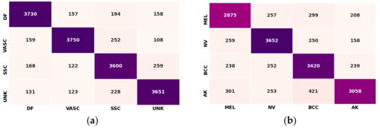 Confusion matrix: (a) confusion matrix before adaptation (dermatofibroma (DF), vascular lesion (VASC), squamous cell carcinoma (SSC), and unknown (UKN) ISIC dataset classes); (b) confusion matrix after adaptation (class 1: melanoma (MEL), class 2: melanocytic nevus NV, class 3: basal cell carcinoma (BCC), and class 4: actinic keratosis (AK); ISIC dataset classes).