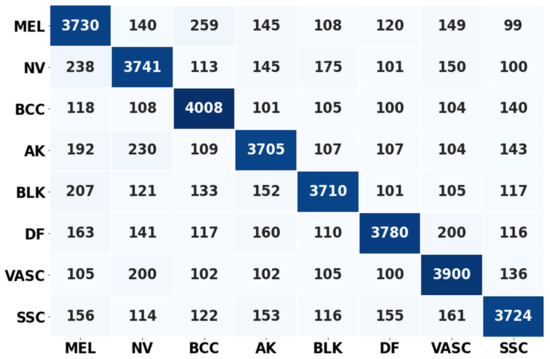 Improving and ensuring healthy lives and promoting wellbeing in the community are some of the United Nations’ Sustainable Development Goals. For that reason, empowering and strengthening health practitioners with sufficient technological advancement (to attain the maximum potential of their health practices) is mandatory. Among other kinds of diseases, skin diseases have increased dramatically in recent decades, and they are now considered a major chronic disease globally [1]. People suffer from a broad spectrum of skin disease types (ranging from low to high severity level), such as eczema, chickenpox, measles, warts, acne, skin tumors, and others [2,3,4]. Skin tumors (melanoma, basal cell carcinoma, squamous cell carcinoma, and others) are the most dangerous type of skin disease and may be fatal if not treated early. For example, melanoma is a form of skin tumor that begins in cells known as melanocytes. Melanoma is more dangerous because of its ability to spread to other organs more rapidly if it is not treated early. To avoid complexities in skin tumors, an initial consultation with a healthcare professional is mandatory. Furthermore, health practitioners must also be equipped with a more accurate, robust, and sustainable solution for diagnosing and treating such diseases. Artificial intelligence can reduce the skin disease epidemic by providing on-time assistance or advice toward the appropriate action for the diagnosis and treatment of skin diseases (assisting the dermatologist) [5]. Some recent studies participated in diagnosing skin diseases using machine learning.