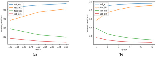 Training and validation accuracy and loss for new sample training in edge models; (a) validation accuracy (val_acc), testing accuracy (test_acc), validation loss (val_loss), and testing loss (test_loss) when new samples were trained at epoch 3; (b) validation accuracy (val_acc), testing accuracy (test_acc), validation loss (val_loss), and testing loss (test_loss) when new samples were trained at epoch 6.