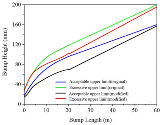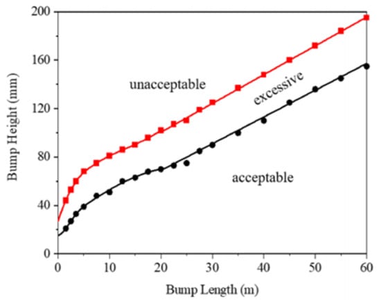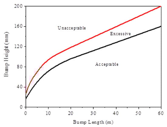 Figure 1 presents the classification standards for the Boeing Bump []. The horizontal coordinate is the bump length, which is defined as the shortest distance from the highest point of the bump to both ends. In the most unfavorable case, the highest bump is located precisely at the midpoint between both ends. In this case, the bump length can be regarded as a half wavelength. The range of the bump wavelength is from 0 to 120 m. The black curve is the upper limit of the acceptable zone, and the red curve is the upper limit of the excessive zone.