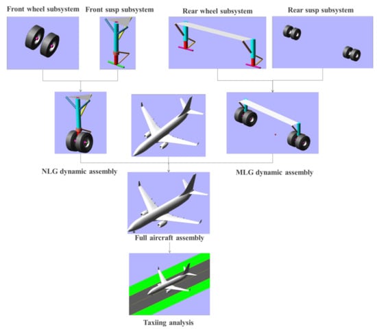 The modeling logic applied in ADAMS/Aircraft is bottom-up, which means that it combines the basic components through several levels to form a complete machine model []. The aircraft model structure includes the following components: