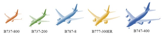 Based on the representative aircraft types presented in Table 1, we selected five typical Boeing aircraft types for this study to build virtual prototype models: B737-800, B757-200, B777-300E, B787-800, and B747-400. Figure 3 shows these five models assembled in ADAMS/Aircraft.