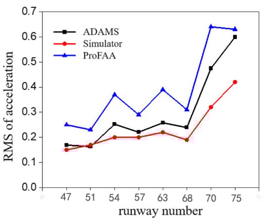 The FAA has used a B737-800 driving simulator to conduct research into airport runway roughness at the Mike Monroney Aeronautical Center in Oklahoma City, OK []. The FAA presents the simulation results in terms of the weighted root mean square of the vertical acceleration of the aircraft cockpit on eight existing runways. These results were obtained from both the driving simulator as well as from the FAA’s computer program, ProFAA, which the FAA uses to compute pavement profile roughness []. In this paper, the driving simulator test results are used to verify the reliability of the virtual prototype compared to ProFAA. The longitudinal profiles of the eight runways were imported into ADAMS/Aircraft. Using the newly built B737-800 model, simulations were performed at the same speed (100 knots) as used in FAA B737-800 driving simulator and ProFAA. We were then able to calculate the weighted root mean square of the vertical acceleration of the cockpit from the ADAMS/Aircraft simulation. Table 3 and Figure 4 present comparisons of the simulation results obtained using ProFAA, the B737-800 simulator, and ADAMS/Aircraft software. Our simulation results obtained from ADAMS/Aircraft are closer to the driving simulator results than to the ProFAA results, and the overall trend of our results also is more consistent with the driving simulator data than with the ProFAA data. With regard to the average difference from the reference driving simulator results, the ProFAA results reached 64% whereas the difference for the ADAMS/Aircraft results was only 14%. Therefore, using ADAMS/Aircraft for aircraft simulations is more reliable than using ProFAA.