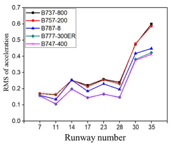 Figure 5 presents the simulation results for the five aircraft models with the same taxiing speed on the same runways (as used in the FAA’s research). As shown, the root mean square of the vertical acceleration of the aircraft cockpit tends to decrease with the increase in the size of the aircraft.