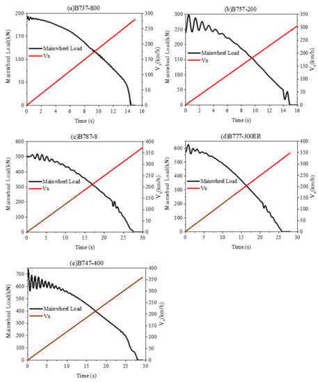 We applied standard thrust level for each virtual prototype model body to simulate aircraft taking off on a runway and then compared the taxiing speed and the mainwheel load level. Takeoff speed is obtained in this section and will be used to determine the most unfavorable speed later in this study. Figure 6 presents the comparisons between aircraft taxiing speed V and mainwheel load for each aircraft model. When the mainwheel load becomes 0, the aircraft is completely off the ground, which means the corresponding taxiing speed can be determined as the takeoff speed. Table 4 shows the takeoff speed for all five models ranges from 250 to 350 km/h.