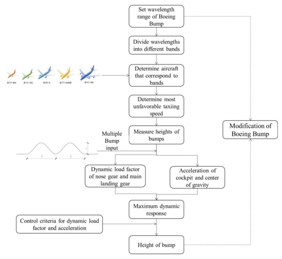 To this end, in this study, we carried out aircraft dynamics simulations by first establishing five typical virtual prototype models. Next, we quantified the superposition effect of the aircrafts’ vibration responses under multiple bumps. We then backcalculated the modified Boeing Bump’s height settings at different wavelengths according to the threshold of each aircraft’s dynamic response.