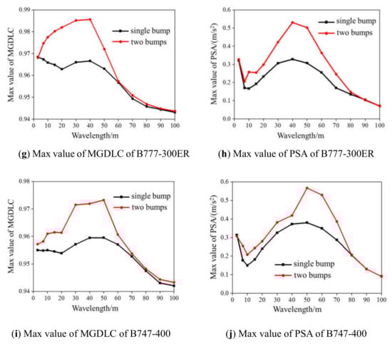 When two successive bump wavelengths with the same shape and amplitude are present on the runway profile, taxiing simulation tests are carried out at the most unfavorable speed for the aircraft’s vibration response. We set bumps with 10-mm amplitude and 3~60m wavelengths. Figure 9 presents comparisons of the maximum values of the MGDLC and PSA after the superposition of two bumps and a single bump. When the wavelength of two successive bumps is the sensitive wavelength of the aircraft at that speed, the frequency of the continuous excitation is close to the natural frequency of the aircraft’s buffer system. Therefore, the dynamic responses of the aircraft reach their peak due to the superposition of resonation.