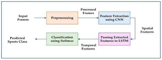 In the video, there exists a correlation between the subsequent frames in terms of their semantic contents. Therefore, if the temporal connections of the frames can be tracked, the classification system will be able to attain a promising result. Hence, it is a prerequisite to pick a specific number of subsequent frames for the analysis of the video data. In this context, at first, a particular number of sequential RGB color frames are selected from the input sports video. Next, some preprocessing operations, resizing, rescaling, augmentation, and normalization, are performed to make the raw frames suitable for further processing. Then, spatial features are captured simultaneously from the processed frames of a video through CNN. After that, the extracted features by CNN are passed to the LSTM layer to capture the temporal features. Finally, a Softmax activation function-based output layer preceded by a fully connected layer is used to classify the sports class. Figure 1 shows the steps of the proposed approach for traditional Bangladeshi sports video classification workflow.