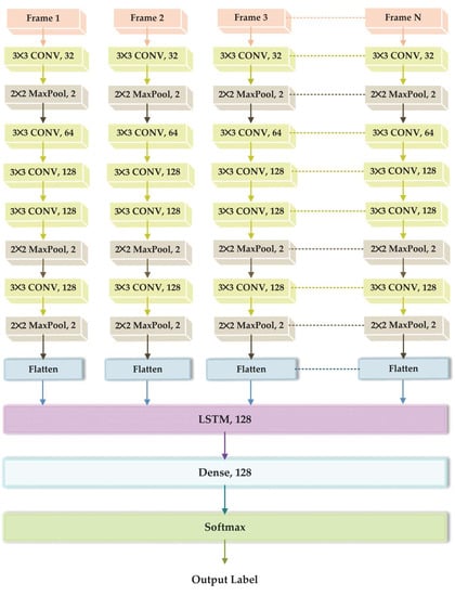 The dimension of the frames is resized to 128 × 128 × 3 for the sake of reducing computational complexity. The augmentation techniques horizontal flipping, rotation, width shifting, and height shifting are applied for better generalization and avoiding positional bias in the frames. Examples of resized and augmented frames are shown in Figure 5.