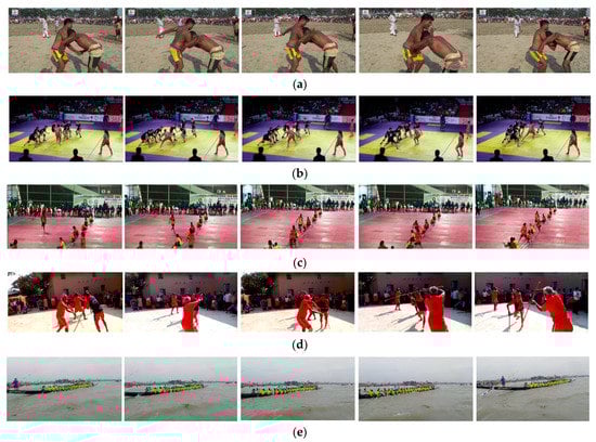 Sequential frames of (a) Boli Khela; (b) Kabaddi; (c) Kho Kho; (d) Lathi Khela; (e) Nouka Baich.