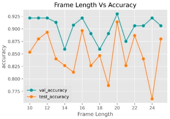 For implementing the scratch model and the fine-tuned pretrained models in classifying the sports videos, the TBSV dataset was split into the train, test, and validation data with the ratio of 70:15:15. That means 70%, 15%, and 15% of the videos per class were randomly assigned for training, testing, and validating the models. Moreover, a specific number of frames is needed to be picked from each video to commence the task of classification. In this regard, we carried out an experiment using the scratch model to determine the right frame length, with 100 video samples in each class. In Figure 4, validation and test accuracy for frame length 10–25 are shown. From this figure, it can be observed that the model exhibits the best result, i.e., near about 93% validation accuracy and 91% test accuracy for the case of frame length 20. Hence, the frame length of 20 was deemed for further analysis and exploration in this ground.