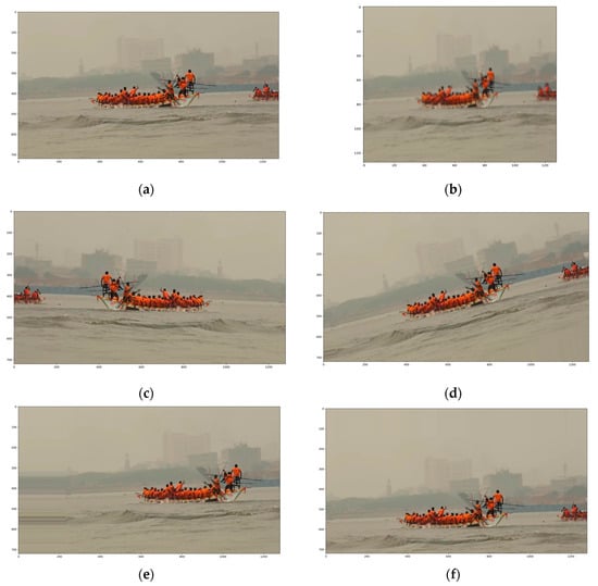 Examples of resized and augmented frames: (a) original frame, (b) resized frame, (c) horizontally flipped frame, (d) rotated frame, (e) width shifted frame, (f) and height shifted frame.