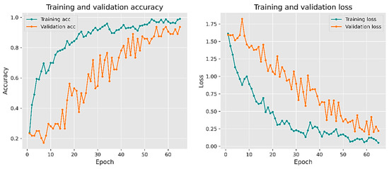 In the above equation, refers to the categorical cross-entropy loss, and denotes the probabilistic value of the class that is fired-up in the one-hot vector. However, the model is trained till 65 epochs with batch size of 64. The training and validation accuracy, as well as the loss curves of this scratch model, is depicted in Figure 6. This figure illustrates that after the 54th epoch, the training accuracy stops increasing, whereas, at this epoch, we got the maximum validation accuracy, i.e., 93%. This observation refers to the fact that at the 54th epoch, the model performs the best, and after this epoch, the model ceases learning. Moreover, Figure 7 represents the confusion matrix of this model applied to test data. It can be observed that a tiny amount of misclassification has been found in some classes due to having some semantic feature similarity with the misclassified classes. Class-wise performance based on different evaluation metrics applied to test data for this model is summarized in Table 3. However, the overall performance is assessed through the F1 score throughout the experiments.