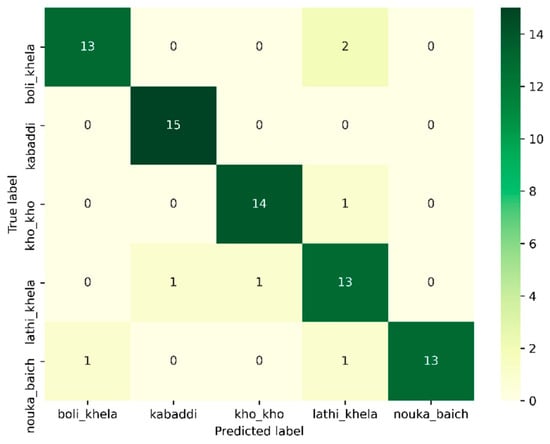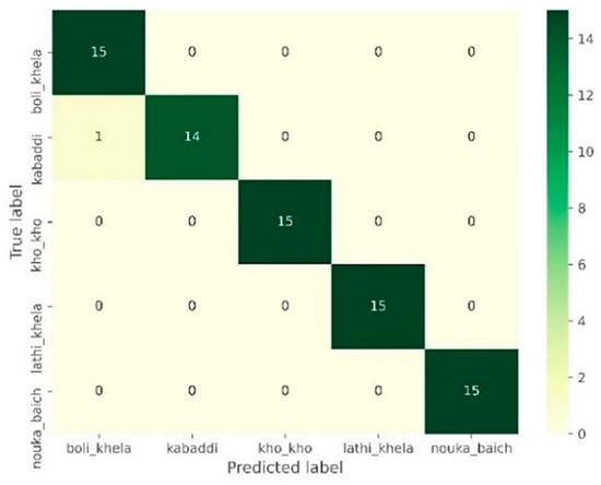 The confusion matrix of this proposed model, i.e., Model 9, is portrayed in Figure 10. The figure shows that, due to having some similar semantic characteristics, only a test sample in “Kabaddi” class was misclassified as “Boli Khela”, which proves this model’s efficiency to a great extent. To get more insight into Model 9’s performance, class-wise values of evaluation metrics are demystified in Table 6.
