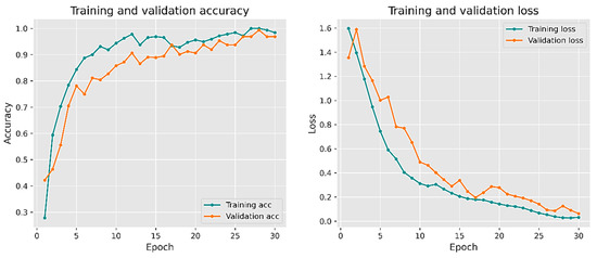 The training and validation accuracy, along with the loss curves of the proposed model, is represented in Figure 9. It can be noticed from this figure that the maximum training accuracy of the model was attained at the 27th epoch, where validation accuracy was the maximum, i.e., 99%.