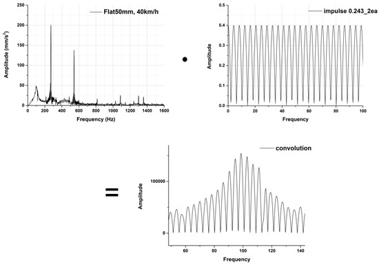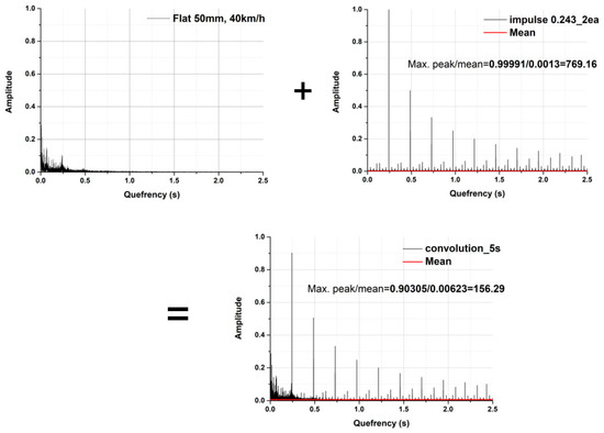These domains in accordance with Equations (1)–(5) are shown in Figure 2, Figure 3 and Figure 4. In the time domain of Equation (1), the periodic response signal of a flat is represented with a convolution of flat signal and impulse, as shown in Figure 2. In the frequency domain of Equation (3), Fourier transforms of the flat signal and the impulse signal are performed before the convolution, as in Figure 3. Then, by taking a logarithm of the convolution, it can be expressed as the sum of the flat signal and the periodic signal of the impulse. In the Quefrency domain of Equation (4), the analysis results are more affected by the impulse signal than the flat one in Figure 4.