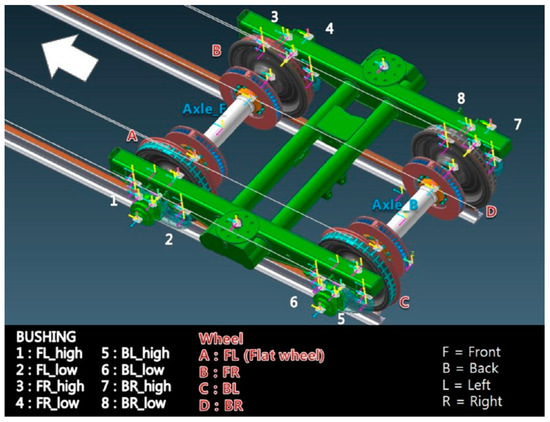 The measurement test using a roller rig is shown in Figure 15. The wheel test conditions are 20 km/h in uniform velocity and a flat of 50 mm at the left wheel. In addition, the data were obtained by installing a three-axis accelerometer in the axle box. The tests were conducted more than three times to obtain good data. The test results are shown in Figure 16. Figure 16a shows all the acceleration signals measured in the two 3-axis accelerometers. The flat signals were measured even on the right wheel without a flat. However, the largest vibration signal was measured on the left wheel z-axis, which is most related to the flat.
