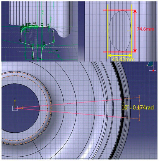 To analyze the vibration signal of a defected wheel with flats, dynamic simulations were performed using commercial software, Recurdyn. Figure 5 is a bogie model composed of a bogie frame, suspensions, and rails for the Seoul urban railway line 7. Figure 6 is the defected wheel model with a flat. The vibration signal was extracted from the axle box of the flat wheel.