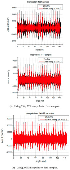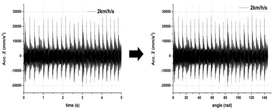Figure 8 is a time domain signal extracted from simulation of wheel-rail dynamics at 2 km/h/s acceleration, and the speed was increased from 40 km/h to 50 km/h for 5 seconds. As shown in Figure 9 and Figure 10, the time domain was changed into the rotation angle domain of the wheel axis, and the angular intervals were equalized using interpolation of signal data points. After that, the cepstrum was applied, and the flat signal detection was obtained as shown in Figure 11.