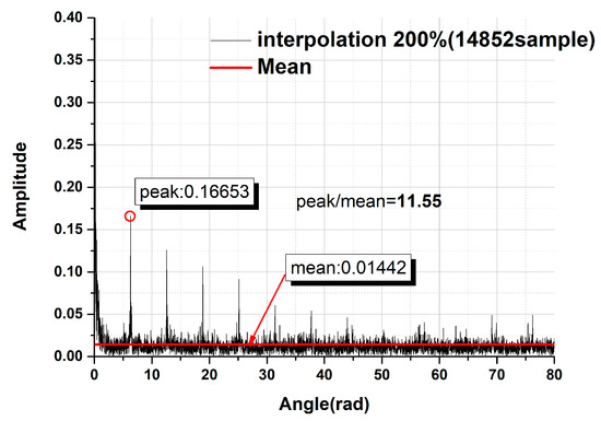 By the way, as the angle data intervals become narrower at the interpolation step, the original signal of the flat can be accurately recovered, and the frequency resolution is also improved. In addition, the flat cyclic signal component at every 2π and the peak/mean value tends to increase. Figure 10 shows that the conformability to the original data is improved as the number of data samples increases using narrower angle data intervals.