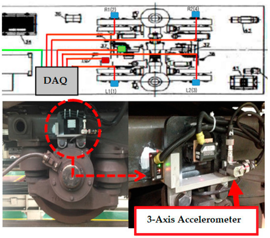 In order to verify that the cepstrum analysis is effective in the case including noise signals by the rail irregularities and the vibrations of bogie components, such as axle bearings and reduction gears, the vibration signals of a normal wheel were measured using acceleration sensors during operation of the Seoul subway Line 7, as shown in Figure 12. The non-contact type speed sensor that generates 90 pulses per a revolution of the wheel was innately installed in the bogie. Using this speed sensor signal, the measured vibration signal can be converted into an angular domain signal. The measured data is shown in Figure 13.