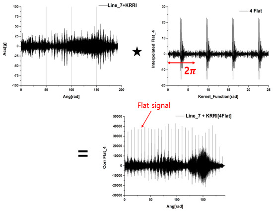 In Figure 19, four flat signals were selected as kernel function g. After that, the cross correlation analysis was performed again. In this analysis, a flat signal was selected as the representative kernel function g for four flat signals of cycle, using the characteristic that the cycle of the flat signal is constant as rad in the angle domain.