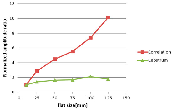 Figure 20 shows the results of the cepstrum and cross correlation analyses for the six different flat sizes which are normalized by the analysis result of the flat size of 10 mm. When comparing the analysis results of the cepstrum to those of the correlation, the cross correlation results indicate a linearly increasing trend according to the flat sizes. It means that the cross correlation is more effective than the cepstrum in diagnosing wheel flat sizes.