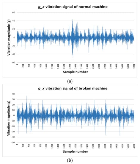 Vibration signal of normal machine (a); broken machine (b) in the g_x direction.