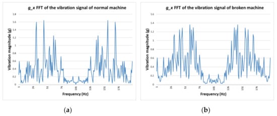 Fast Fourier Transform (FFT) transform of a (a) normal machine; (b) broken tooth machine in the g_x direction.
