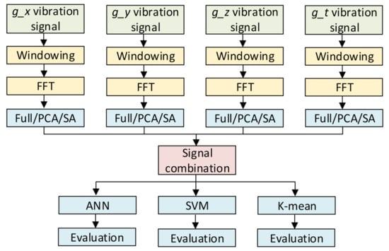 In general, data augmentation is mostly used in image processing [] because it is easy to evaluate whether the generated data is similar to the original data based on the judgement of human. In contrast, it is difficult to evaluate the data augmentation in data analysis because it depends on a different characteristic of the data. Therefore, to evaluate the generation data, we require a comprehensive test with various conditions. This section introduces three fault detection approaches for vibration signals, which can be applied to the generated signal. The overall fault diagnosis diagram with different data processing and multiple AI models is shown in Figure 4. The vibration data in each direction is windowed and transformed into the frequency domain for further process. Then, we provide 3 different methods for feature extractions, includes full analysis, PCA transform, and statistical analysis. After that, all four signal is combined and feed to different AI algorithms, includes artificial neural network (ANN), support vector machine (SVM), and K-mean clustering. All the approaches introduced in this section will be the basis for further analysis and evaluations.