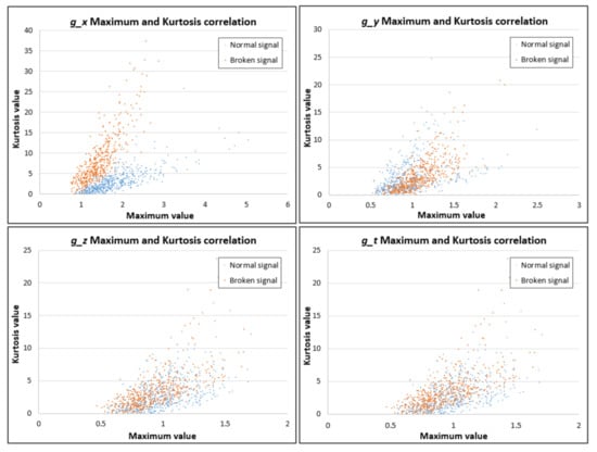 The statistical relationship between the normal and broken machine signals can be considered a reliable classification method, as shown in Figure 7. The statistical elements of the normal and broken signal are similar in the g_y, g_z, and g_t directions, but they are different in the g_x direction. The most difference is seen in the maximum value (4) and kurtosis value (5) of the g_x signal. In Figure 8, if we break down the relationship between them, we can easily classify the normal and broken machine signals.