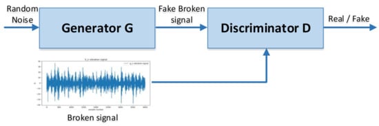 The adversarial procedure is illustrated in Figure 9. Most existing GANs perform a similar adversarial procedure in different adversarial objective functions. In this paper, the GAN algorithm is used to generate the broken machine data signal; therefore, only broken training data is fed into the generator. The generator generates the broken data using random noise, which ranges from 0 to 1 with normal distribution to guarantee the difference in the output data.