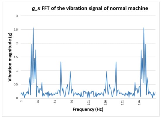The data generated using GAN includes 500 s of vibration signals, which includes the four signals g_x, g_y, g_z, and g_t. The generated broken signal is shown in Figure 10, which contains the individual g_x vibration signal. The preprocessing procedure for the generated signal is the same as that for the original signal, and, based on that, we can evaluate its quality using previous fault detection methods. Note that we generate the signal only for the broken machine because the broken signal is assumed to be less than the signal obtained for the original data. The FFT of the g_x signal is calculated and shown in Figure 11.